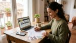 Mujer joven preparando documentos para su cita previa del DNI, con pasaporte y fotos en la mesa.